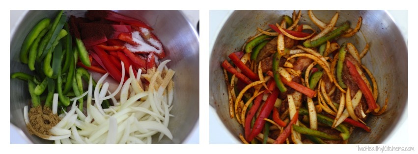 All you have to do here is toss your strips of peppers, onion and chicken with a bit of oil, and a super-simple seasoning combo of chili powder, cumin, garlic powder and salt.