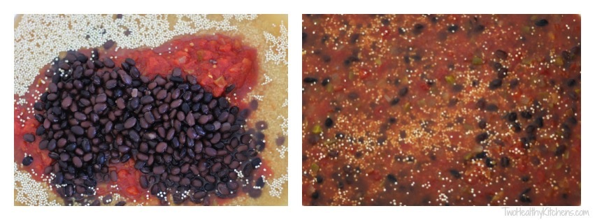 And you don’t need an extra bowl here, either. Simply mix up your salsa, black beans, chicken broth, and quinoa right in a 9×13 baking dish. (I like to coat it with cooking spray first.)