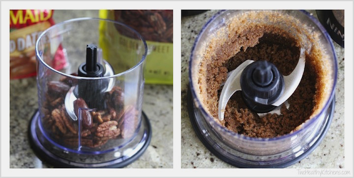 - In a mini food processor (I use the smallest one from this set), pulse 3/4 cup pecans and dates until fairly smooth (pulsing for about 2-3 minutes), scraping sides of processor occasionally as needed. (The consistency will not be totally smooth and will be a thick, slightly grainy paste like very, very thick natural peanut butter.)