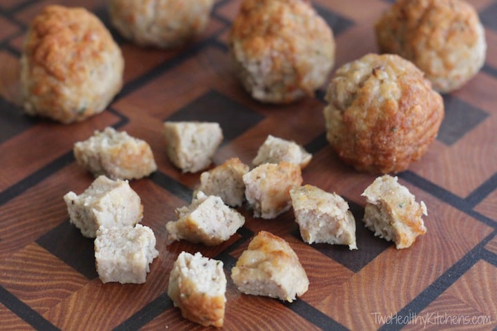 Meatballs: Turkey and chicken meatballs come in a variety of sizes. We typically purchase meatballs that are about 1 1/2" in diameter. For that size, we find it works great to cut each meatball into about 12 pieces, but you can adjust this according to the size of the meatballs you purchase. Your goal is to make them appealingly bite-sized.