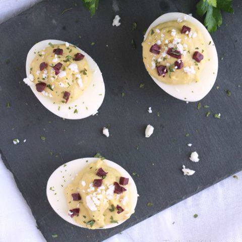 The creamy hummus filling pairs beautifully with a perfectly cooked egg. Topped with salty-tangy feta and bits of kalamata, plus a little hit of pretty parsley, these deviled eggs are a delicious balance of flavors, all dressed up so gorgeously, too!