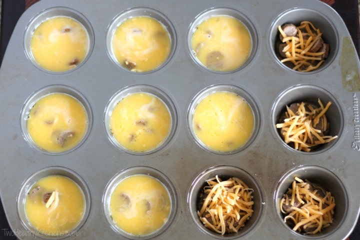 - Place 5-6 slices of sausage in the bottom of each muffin cup and divide cheese evenly among the 12 cups.